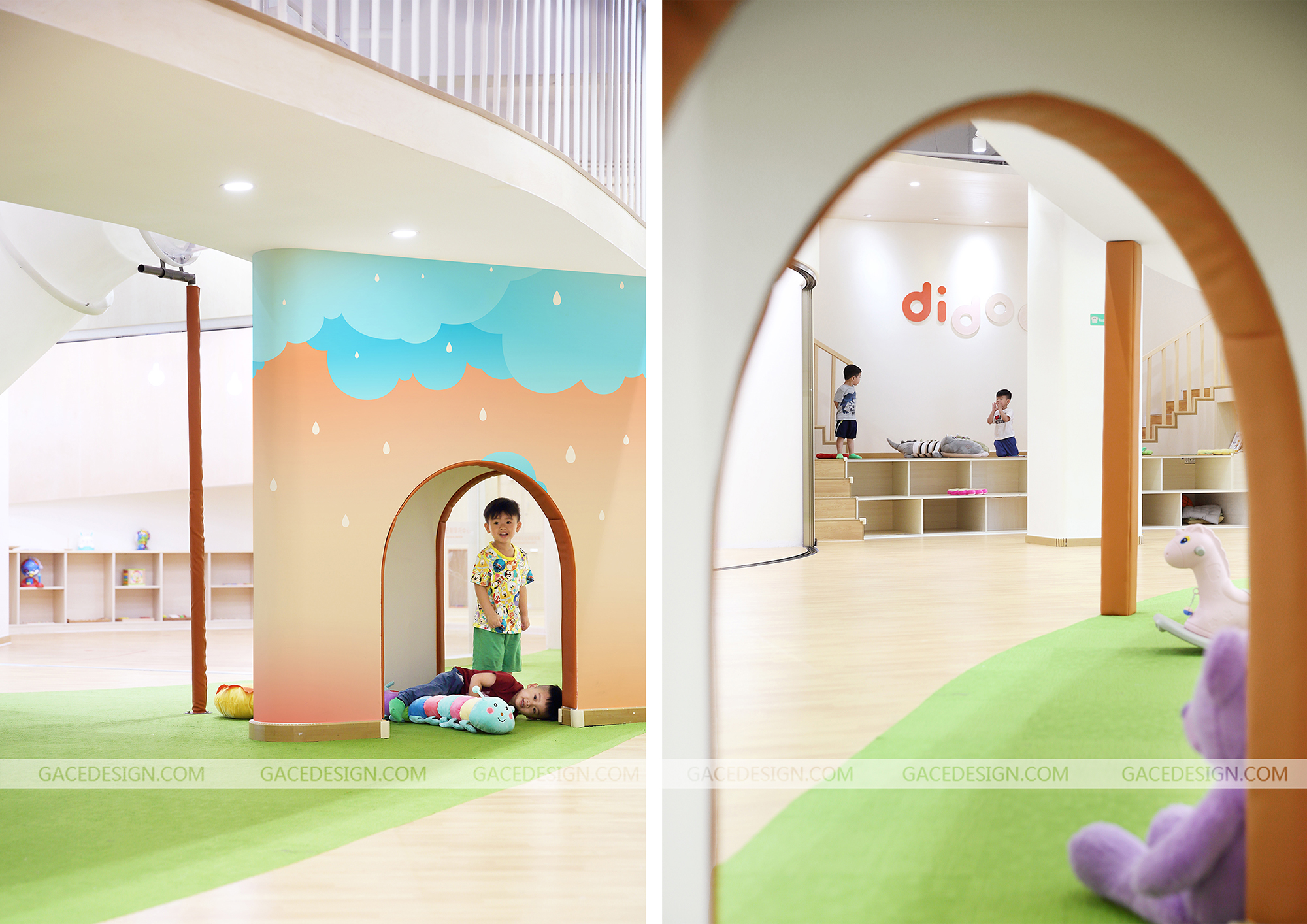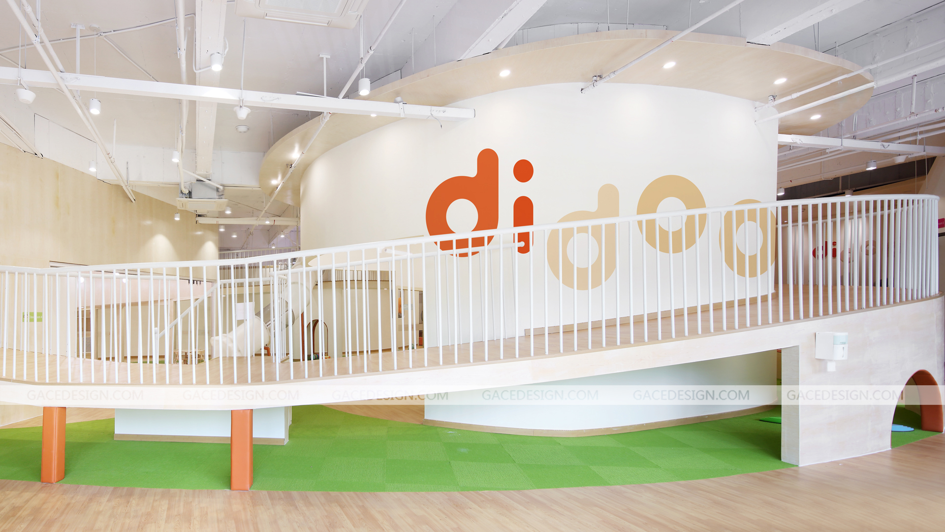 迪多國(guó)際全日制早托中心,為新時(shí)代父母提供安全,科學(xué),全面的幼兒全日制托管服務(wù),致力于培養(yǎng)2-6歲兒童優(yōu)秀的行為習(xí)慣、獨(dú)立人格及社交能力。作為全日制日托中心,是兒童的另一個(gè)家,這是一個(gè)謀求大尺度變化的空間設(shè)計(jì),規(guī)避程式化的隔班教學(xué),將自然元素引入,打造全新的敘事空間。營(yíng)造簡(jiǎn)潔自由的空間,干凈的木色地板和青翠的草甸鋪陳開(kāi)來(lái),Didoo的橙色點(diǎn)綴其中,自然系配色去嘈雜化令空間更親和。