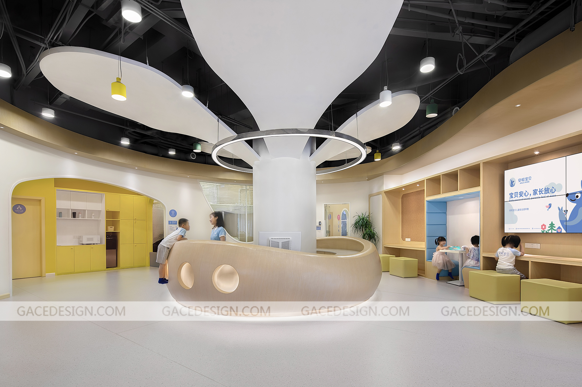 安啦寶貝是一家專注于培養(yǎng)兒童安全感的教育機(jī)構(gòu),提供父母課堂培訓(xùn)及兒童綜合評(píng)測(cè)服務(wù),其創(chuàng)業(yè)者擁有13年豐富的行業(yè)經(jīng)驗(yàn),多年來(lái)不斷在兒童發(fā)展心理學(xué)、NLP、薩提亞、家庭系統(tǒng)排列、靈性成長(zhǎng)及傳統(tǒng)文化等領(lǐng)域中學(xué)習(xí),探索,成長(zhǎng)。安啦寶貝兒童安全感早教利用一個(gè)豐富多變的曲線將異形、多柱且零散的空間整合起來(lái)。這條曲線猶如一條彩帶,激活了整個(gè)空間,使其既完整,又多變,趣味盎然且動(dòng)感十足。