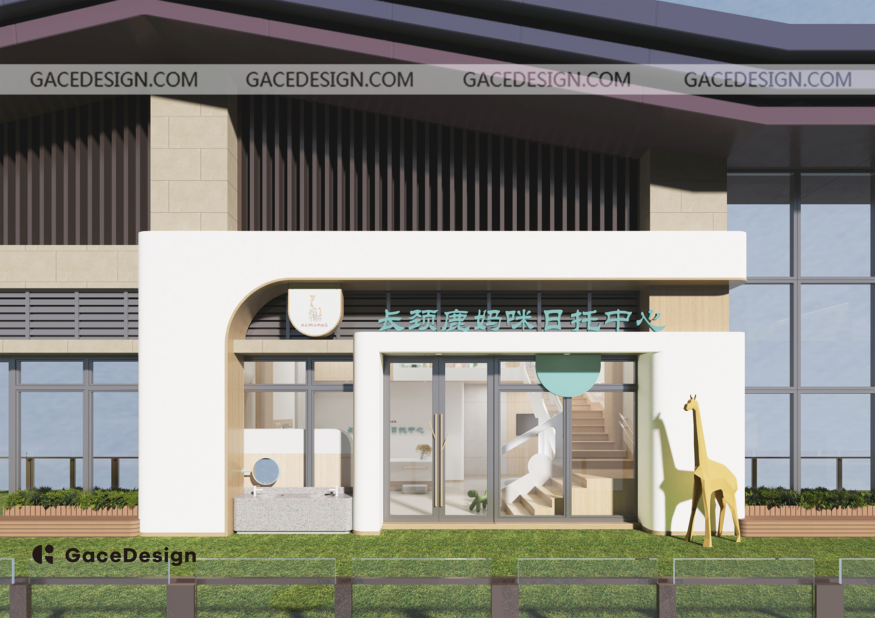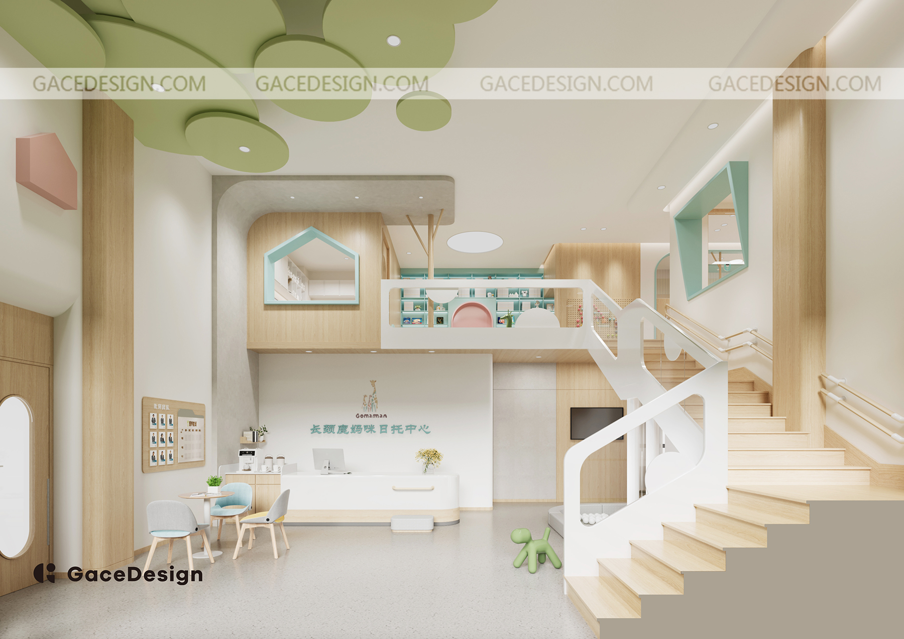 設(shè)計(jì)闡述:設(shè)計(jì)靈感來自于品牌名“Giraffe Mommy 長頸鹿媽咪日托中心”,其品牌示意可以聯(lián)想到到草原和森林中長頸鹿媽咪和一群生活在森林中的小人兒們,長頸鹿也被稱為“樹之精靈”,它們通常生活在群體中,被稱為“塔”。塔內(nèi)的長頸鹿之間會互相社交和幫助,成為了默契的伙伴。設(shè)計(jì)師將這些元素刻畫在空間中,一個(gè)能承載各種活動(dòng)的開放式大廳,枝繁葉茂的大樹屹立在大廳中,森林里帶著俏皮的木屋,空間簡潔舒適。孩子們能從室內(nèi)看到外面的街道,室外的人也能瞧見室內(nèi)活動(dòng)的樣子。在舒適的開放性空間生活的同時(shí),也能感受到和附近區(qū)域環(huán)境以及社區(qū)的羈絆。