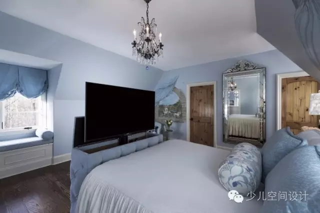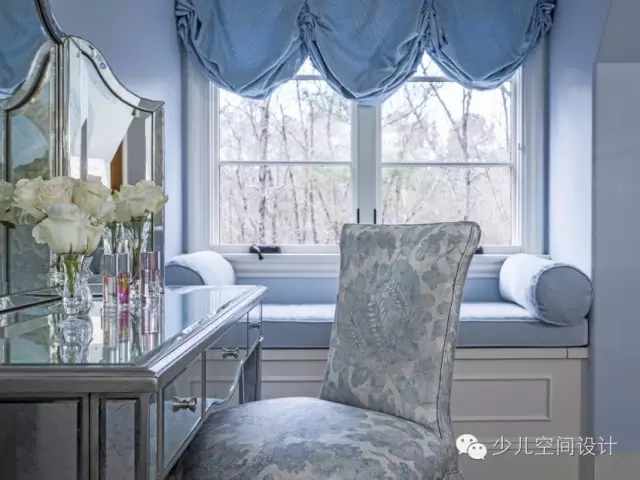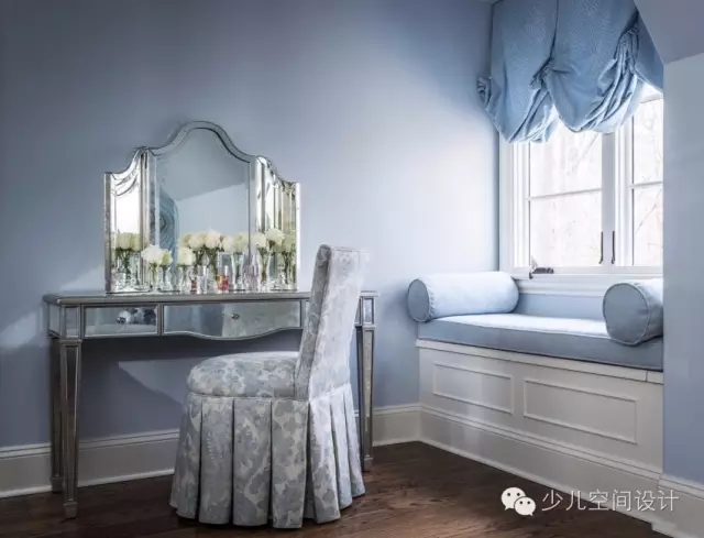 柔和的板藍色和銀色用來打造像公主一樣的宮殿。設(shè)計師給她設(shè)計一個特別舒適的窗口角落,也方便閱讀。從流動的瀑布式窗口處理的啟示進行概念設(shè)計的手繪壁畫。在床上,還定制了床罩和枕頭等匹配裝飾的家居用品。