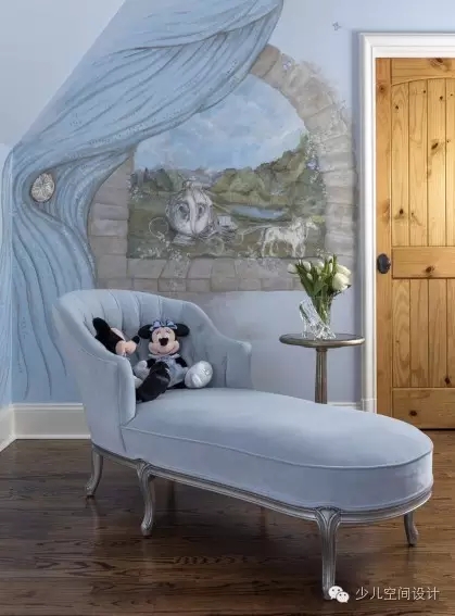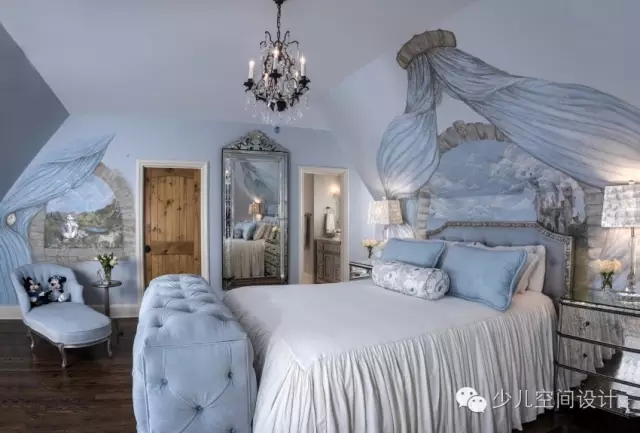 設(shè)計的壁畫,這與童話的主題,品味相輔相成,時尚典雅,讓人產(chǎn)生幻想的空間,從而解決了房間里面天花板和墻壁的問題。