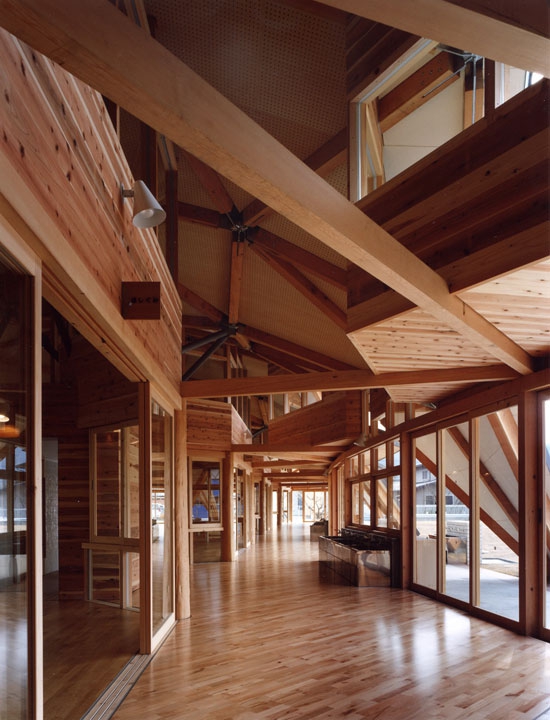 maihara幼兒園它位于日本滋賀縣,它的周邊都是一些新建的住宅區(qū)?;炷恋暮凶佑蛇B續(xù)的木頭屋頂鏈接為一體,屋頂用連續(xù)的三角形的平面構(gòu)成;它的結(jié)構(gòu)的強(qiáng)度和形狀的連續(xù)性有很大的自由度。屋頂使用2.5米長的木梁和六角形的金屬(接頭)配件,工廠預(yù)制,現(xiàn)場裝配。木制桁架和混凝土盒子組合出各種各樣的結(jié)構(gòu)表現(xiàn)效果。