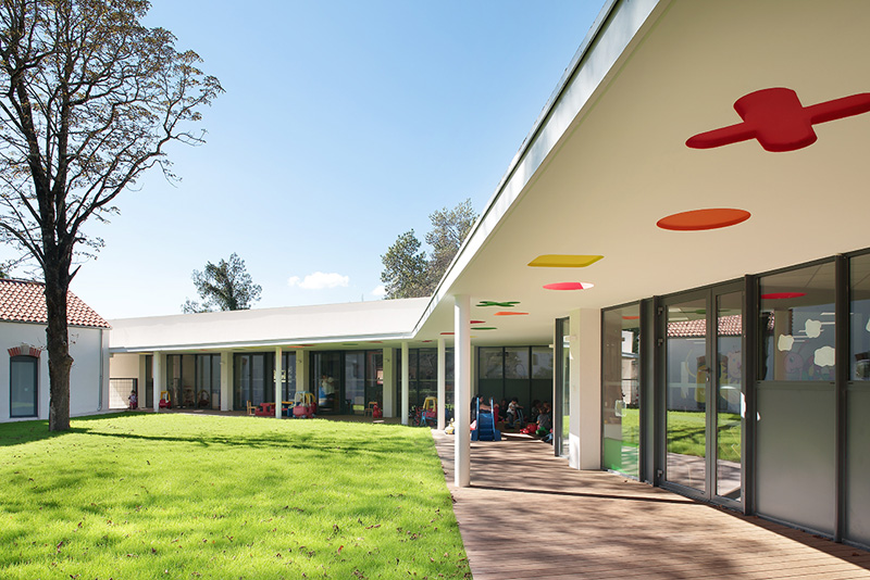 這個(gè)育兒中心是以之前的一個(gè)農(nóng)業(yè)部門改建而來,位于兩條狹窄的街道的街角之處,值得一提的是育兒中心與l’Ecureuil療養(yǎng)院建在一起:兩個(gè)建筑之間有一個(gè)漂亮的花園里面有很多栗子樹,增加了它們之間的聯(lián)系和代際關(guān)系。(幼兒園設(shè)計(jì))