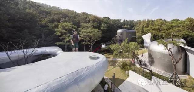 第三棟樓(鼻子噴泉)臨近水池與天空列車。光潔的鼻子是提供了聲音與動(dòng)感的噴泉,讓這個(gè)寧?kù)o的環(huán)境頓時(shí)有了生氣。這里的形式呼應(yīng)了整體的曲線性基調(diào),窗戶也呼應(yīng)了整天,但是你若是仔細(xì)觀察你會(huì)發(fā)現(xiàn)摩爾斯電碼。你會(huì)嘗試解讀它們,說(shuō)不定也能猜出一些簡(jiǎn)單內(nèi)容。二層的陽(yáng)臺(tái)向兩側(cè)敞開(kāi),貫通森林的視線映入眼簾。視線與空間的聯(lián)系恰恰是整棟樓設(shè)計(jì)的首要考慮因素。在2層的咖啡廳,你不僅可以看到內(nèi)院,還能坐擁面對(duì)其他兩棟樓的極佳視野。