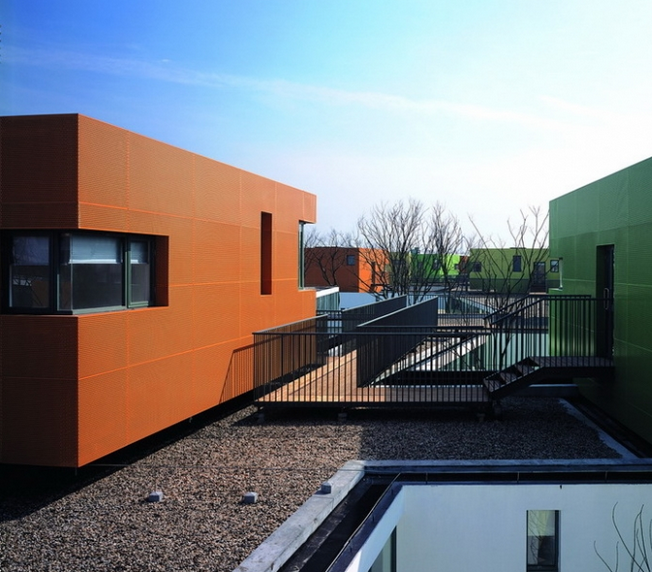 在班級單元的設計上,活動室因為需要和戶外活動院落相連而全部設于首層,臥室則被覆以鮮亮的色彩置于二層,臥室間相互獨立并在結構上令其樓面和首層的屋面相脫離,強調其漂浮感和不定性,這種不定性以及恰當尺度的相互分離導致一種看似隨意的集聚狀態(tài),空間產生張力。每三個班級的臥室以架空的木棧道相連,這些臥室如依依不舍的村落般友好和親切。