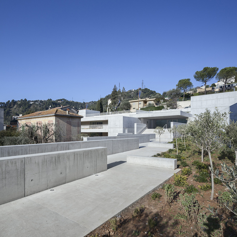 在法國(guó)的一家托兒中心名為L(zhǎng)a Trintite兒童日托中心,這間托兒中心的位置非常有趣,是在公墓和一座購(gòu)物中心中間的一個(gè)花園深處,建筑在場(chǎng)地中的植入,連通周邊環(huán)境,為整個(gè)小鎮(zhèn)創(chuàng)造了一個(gè)新的物理連接——形成一個(gè)連接上部和下部道路的公共通道。受到經(jīng)濟(jì)要素的現(xiàn)實(shí),我們限制了挖掘量,因此將停車(chē)場(chǎng)放置在屋頂上,這樣地面空間也可以被塑造成為新的公共空間。兩層樓底板挑出了3米的寬度,以保護(hù)操場(chǎng)不受到太陽(yáng)的直曬。這些水平層面要素的設(shè)計(jì)平衡了結(jié)構(gòu)性的垂直框架,并且容納了日托中心的所有功能要素需求。