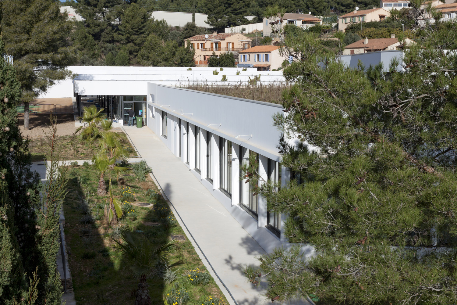 位于法國的Les Severiers幼兒園這個幼兒園設(shè)計(jì)包括著三個部分,一個食堂和在Ciotat的住宅區(qū)內(nèi)的城市化發(fā)展。園方的想法是建造一個可以使它融入到現(xiàn)存的松樹林中這樣的幼兒園。幼兒園的不同體積微妙地形成了一個緩坡,這可以在學(xué)校中形成天然的間隔。