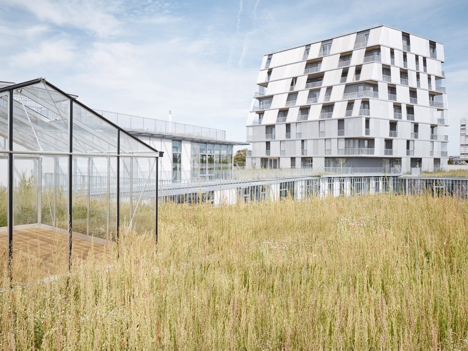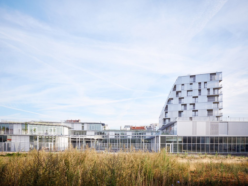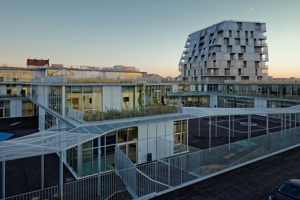 學(xué)生宿舍的設(shè)計(jì)基于4個(gè)主要建筑學(xué)原則。首先,項(xiàng)目作為一個(gè)整體要具有合理的功能(結(jié)構(gòu)和技術(shù)空間的疊加),同時(shí)還要緊湊。距離其他功能分區(qū)的距離使它有所脫節(jié),具有一定的獨(dú)立性。由于宿舍區(qū)被設(shè)置在盡可能北的方位,最窄的立面朝向Jean-Jaurès大街,平臺(tái)不會(huì)阻擋陽光進(jìn)入室內(nèi)。這也保證了操場能夠享受足夠多的陽光。