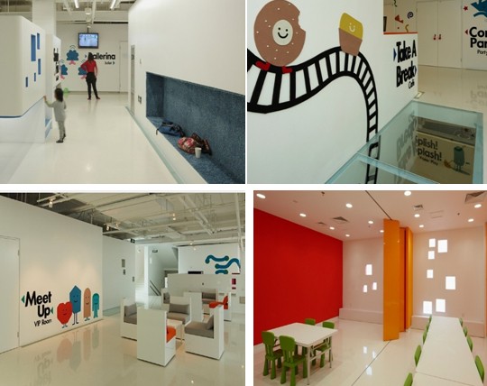 許多的空間設(shè)計都非常合理、實用而且美觀。兒童休息區(qū)設(shè)計為有長格子形狀的毛茸茸長椅,根據(jù)兒童的身高尺度來設(shè)計,小比例的空間使內(nèi)部更加豐富??Х葟d與派對室設(shè)計了透明的地板,能清楚的告訴小朋友,下邊還有東西,能激發(fā)孩子探索欲望的積極性,打破了地板的界限。家長休息室根據(jù)大人的人體比例設(shè)計了舒適的座位,家長之間更方便交流孩子學(xué)習(xí)之間的心得體會,休息室顯得格外可愛、溫暖。小食堂的設(shè)計,在內(nèi)部這些墻面上采用了模擬自然陽光的技術(shù),用以彌補采光不足。整個空間處處都體現(xiàn)了小盒子的造型,這些空間設(shè)計都是很溫馨、浪漫的。(幼兒園設(shè)計)
