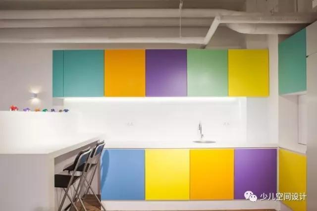 就餐區(qū)和休息區(qū)是專門(mén)為家長(zhǎng)和老師設(shè)計(jì)的兩個(gè)區(qū)域,他們可以在這里交流溝通孩子的情況。就餐區(qū)在功能上是一個(gè)帶有多重色彩櫥柜的敞開(kāi)式廚房,它這樣的設(shè)計(jì)還可以激發(fā)孩子的興趣以及異想天開(kāi)的想象力。就餐區(qū)的顏色都源自Babysteps的標(biāo)識(shí)中相同的色調(diào),與幼兒樂(lè)園整體的設(shè)計(jì)在視覺(jué)上形成統(tǒng)一,同時(shí)它也與整個(gè)室內(nèi)空間微妙的單色調(diào)相互協(xié)調(diào)。