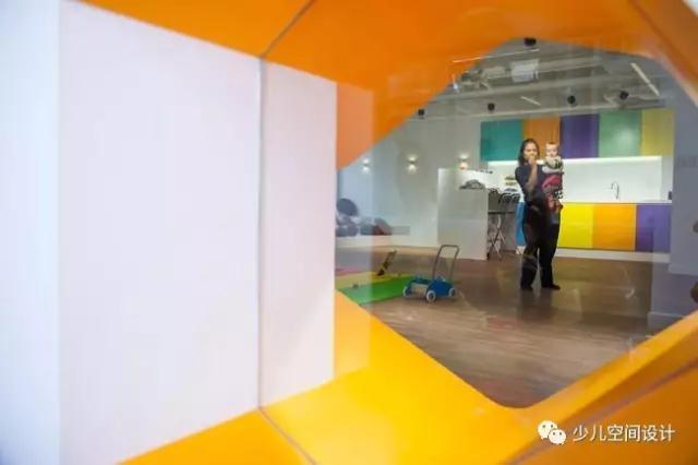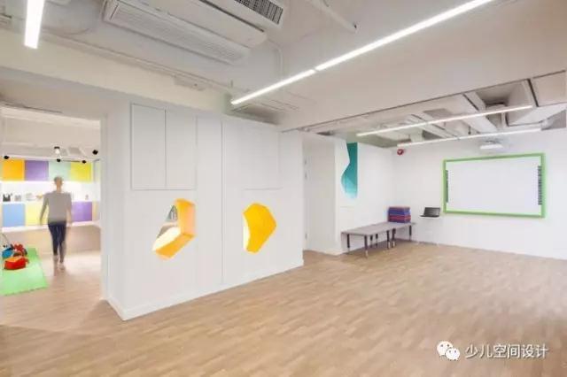 探索和運(yùn)動(dòng)區(qū)是幼兒樂(lè)園的重點(diǎn)區(qū)域。幼兒園室內(nèi)設(shè)計(jì) 在這個(gè)開(kāi)放式的,明亮而怡人的活動(dòng)區(qū),可以容納多種運(yùn)動(dòng)方式:純粹運(yùn)動(dòng)的方式、感知觸覺(jué)的方式、還有安靜的方式。一面帶有幾何圖案的彩色墻壁極具特色,這堵墻圍成了一個(gè)儲(chǔ)存區(qū)角,并且自然而然地將活動(dòng)區(qū)內(nèi)不同方式的運(yùn)動(dòng)區(qū)分割開(kāi)來(lái)。進(jìn)一步來(lái)說(shuō),這種分割還可以讓孩子和家長(zhǎng)通過(guò)墻上幾何圖案的窗框看到教室里面的情景。