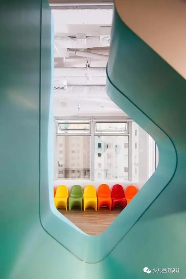 緊鄰的休息室是由鋸齒狀的三層平臺(tái)形成的區(qū)域,建在房間的一個(gè)角落,靠著窗臺(tái)玻璃幕墻的邊緣,并沒(méi)有占用孩子們的游戲區(qū)。無(wú)論是欣賞孩子學(xué)習(xí)的成果,還是日常點(diǎn)滴的進(jìn)步,休息區(qū)都為家長(zhǎng)提供了一個(gè)完美的視角去觀察孩子。
