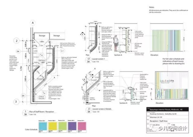 幼兒樂(lè)園的入口處設(shè)置了透明的玻璃門(mén),純白色的金屬百葉窗,簡(jiǎn)潔利落的百葉窗顯得美觀大方。入口的一側(cè)還設(shè)有接待臺(tái),同樣是由柔和彎曲的彩色百葉窗造型設(shè)計(jì)而成。Babysteps的標(biāo)識(shí)置于接待臺(tái)后面的墻上,五彩的字體設(shè)計(jì)更顯活潑可愛(ài)。燈光打在百葉窗上形成微妙的光影,使得BabySteps產(chǎn)生了一個(gè)工藝的視覺(jué)形象。