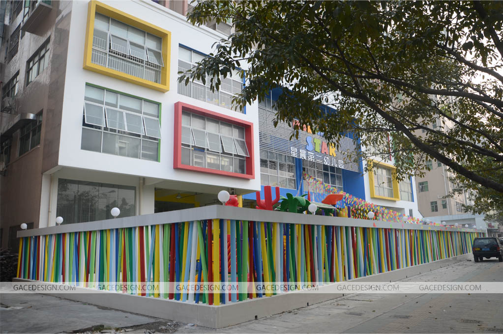 幼兒園院墻形式有通透、封閉和兩者混合的做法,在新建居住區(qū)中,應(yīng)設(shè)置安全、美觀、通透的圍墻(或隔離設(shè)施),并應(yīng)安裝安保監(jiān)視系統(tǒng)。一般采用通透的鐵柵,孩子們玩耍嬉笑聲可以增加居住區(qū)的歡樂氣氛,對(duì)幼兒園來說也不會(huì)感覺在大墻的封閉下。如果幼兒園是沿城市交通道路或在擁擠的居住區(qū)中,則可采用封閉的或部分開敞的院墻,從而使內(nèi)部安靜不受干擾,但實(shí)墻應(yīng)根據(jù)當(dāng)?shù)亟ㄔO(shè)規(guī)劃和園內(nèi)景觀的整體要求,因地制宜地進(jìn)行裝修,其色彩應(yīng)與周圍建筑環(huán)境相協(xié)調(diào),其色彩宜采用暖色調(diào)。