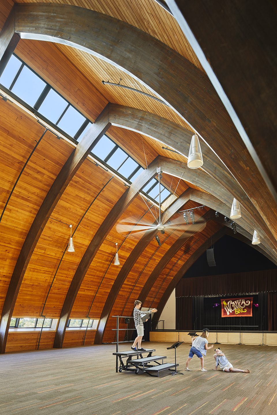 Westside中學(xué)致力于對(duì)既有的教堂進(jìn)行大規(guī)模的修復(fù)和重新利用,同時(shí)盡可能地減少施工帶來(lái)的能源消耗。教堂中殿的叉骨形拱頂成為了本次設(shè)計(jì)的靈感來(lái)源。設(shè)計(jì)師保留了既有的45英尺長(zhǎng)的膠合木拱頂,并對(duì)既有空間進(jìn)行了重新配置,使其能夠容納教室、辦公室、服務(wù)空間、餐廳和儲(chǔ)藏室等,同時(shí)將既有的健身房保留下來(lái)。