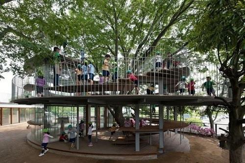 半暴露的結(jié)構(gòu)被中心樹木巨大的枝葉覆蓋。建筑內(nèi)部高5米,這個(gè)開放的巨大“樹屋”中有許多壓縮和封閉的空間,只有半蹲、爬行的小朋友才能通過。為了保護(hù)小朋友,建筑師沒有設(shè)計(jì)過多欄桿,而是在地面上覆蓋了一層橡膠墊,以減輕意外磕碰。