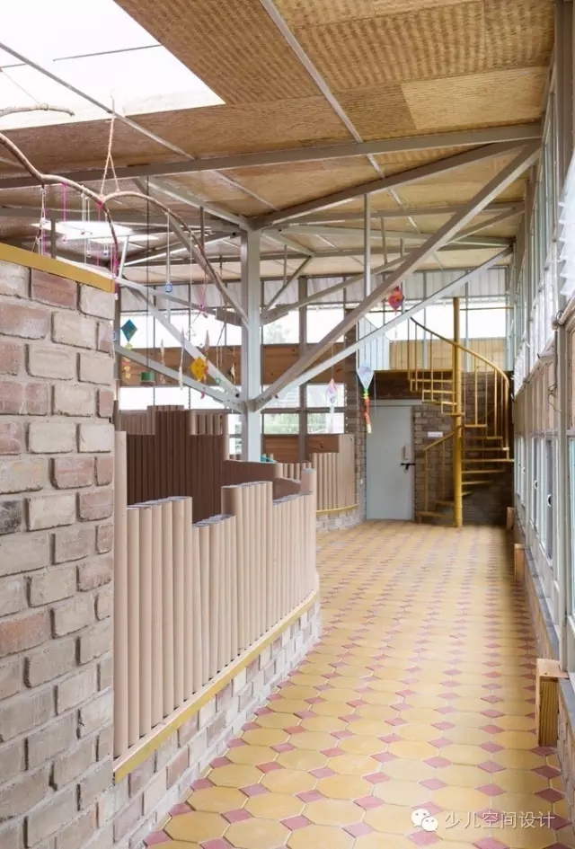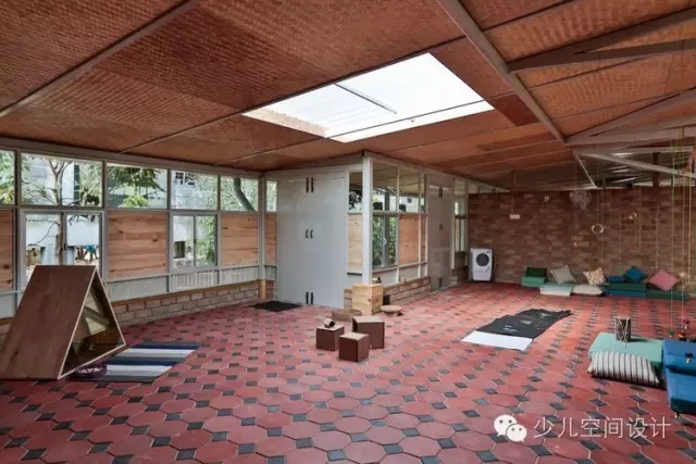 建筑包含4間教室,中心廣場(chǎng)邊上的一間工作室和一間幼兒?jiǎn)⒚芍行牡姆块g與廣場(chǎng)之間有著過度的濾光板。衛(wèi)生間的設(shè)計(jì)考慮到了低領(lǐng)人群,小型的尺度不僅適合孩子,還方便監(jiān)護(hù)。衛(wèi)生間暴露的排水管與小便墻的設(shè)置能夠被孩子舒適地使用,并易于維護(hù)。