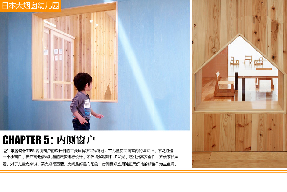 5、這間木制幼兒園的內(nèi)部有各種形狀的門窗,連通各個(gè)空間。孩子們能感覺到從天花、門窗進(jìn)入的自然光線的變化,甚至可以追逐他們并一同玩耍,讓孩子在日常生活以及活動(dòng)中享受光的禮物。合適且充足的照明,能讓房間溫暖、有安全感,有助于消除孩子獨(dú)處時(shí)的恐懼感。