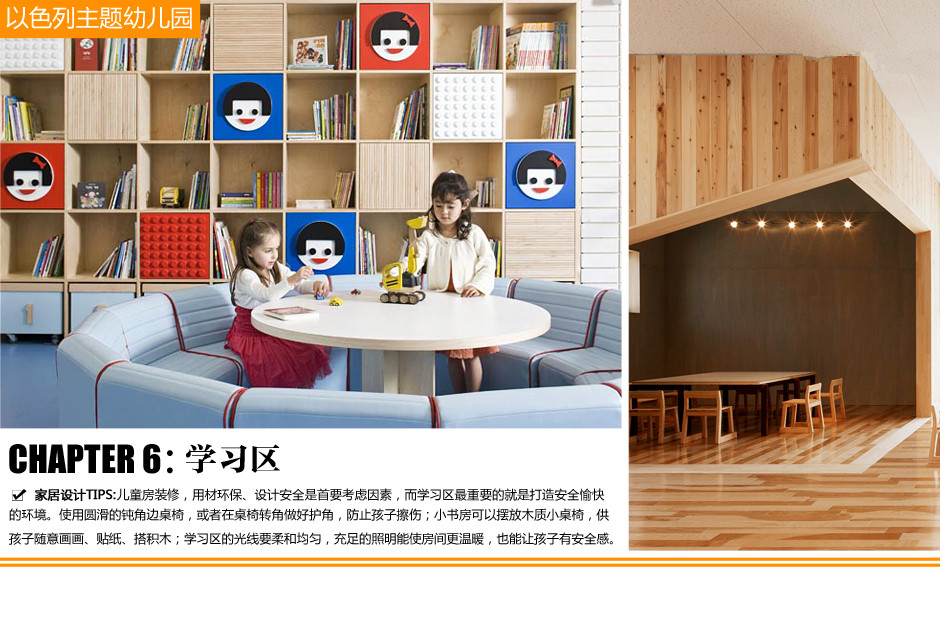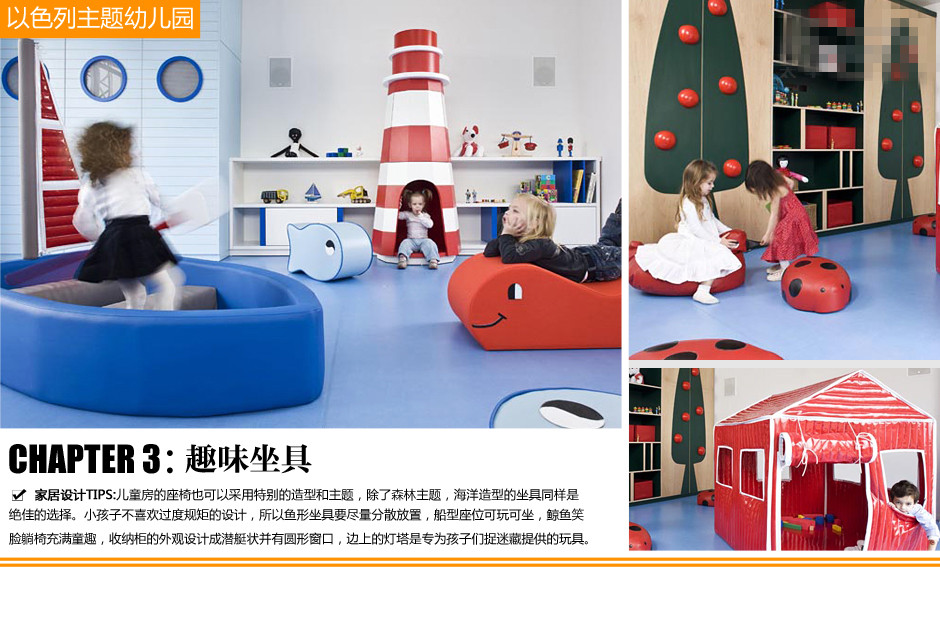 3、這是幼兒園的其中一間教室,低矮的花型座椅散亂分布在教室四處,立體紅蘋果懸掛在樹形的模型上,黑板上懸掛著松樹圖案的浮雕。微型帳篷安放在教室的中心區(qū)域,里面填滿了紅白兩色的乙烯基塑料填充物,悅目的色彩給童年增添了不少生動(dòng)的記憶。