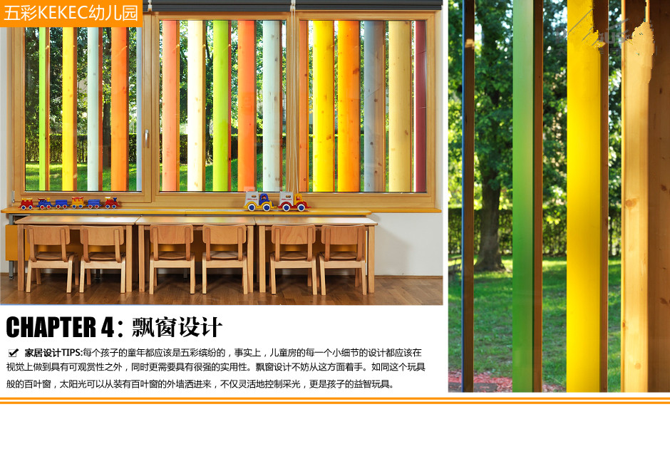 4、這座幼兒園建筑的玻璃表面裝有一層可旋轉(zhuǎn)的垂直百葉窗,百葉窗的木條一面漆有五顏六色的油漆,另一面則保持木材的原樣。這些木條除了可以用來遮光,為小朋友提供娛樂設(shè)施之外,還能讓小朋友們?cè)谕嫠V袑W(xué)會(huì)用雙眼分辨這九種顏色。