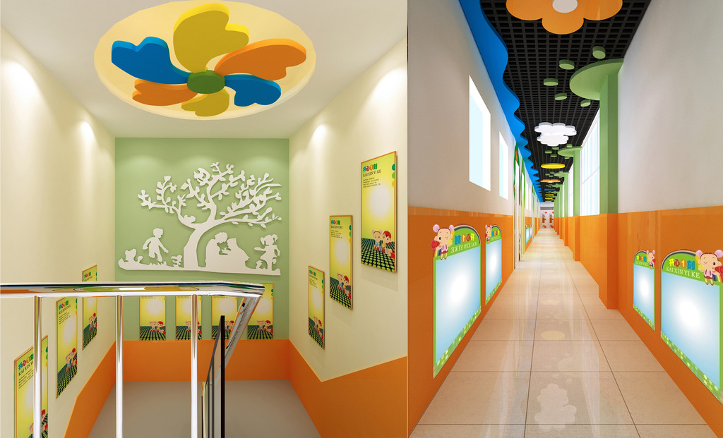 大廳頂部為雙園形黃綠套色吊頂,象征母親與幼兒,月亮與星星;大廳墻面制作一米半高的中孔文化墻,從造型孔中露出背面擺放的金魚缸,自由自在的金魚呈現(xiàn)出幼兒園生機(jī)活潑的景象。園的廊墻面布置以抽象畫或抽象作品為主,色調(diào)為黑、白、灰、橙色的搭配為主。走廊頂部安裝網(wǎng)狀鋼網(wǎng),便于吊掛裝飾物。走廊立柱以五彩或橙色為主。(幼兒園室內(nèi)設(shè)計(jì))